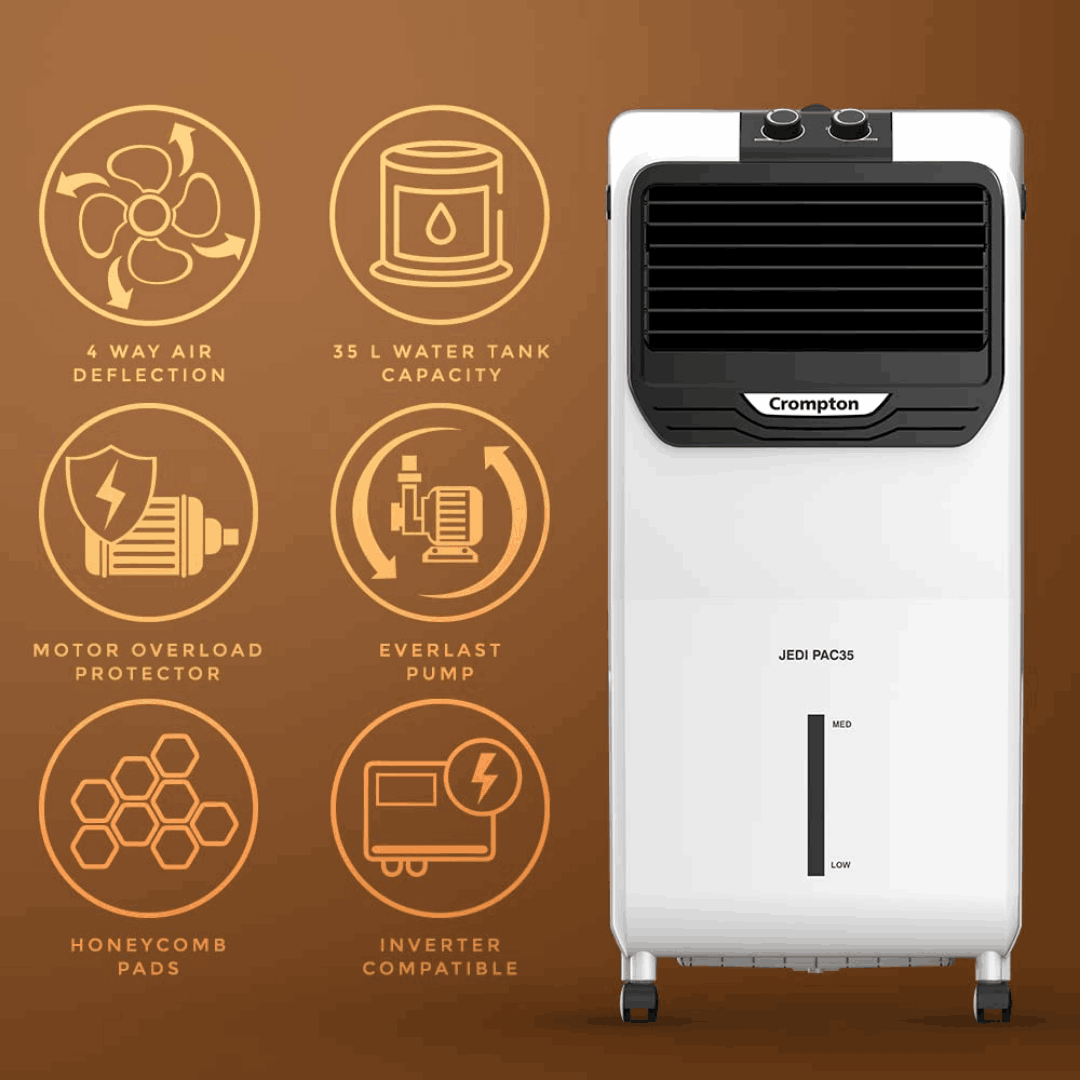 • Product: Crompton Jedi PAC 35 Personal Air Coolerwith water tank capacity (upto brim) of 35 L; Suitable for 140 sq. ft. room size