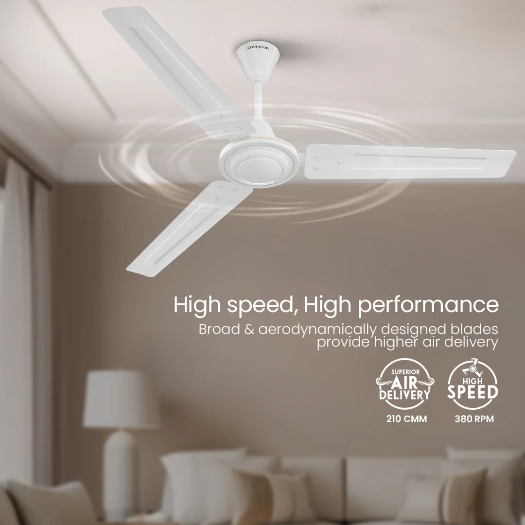 Experience the epitome of comfort with Crompton's Surebreeze Brizair. Designed to perfection, these fans are equipped with double ball bearings for enhanced durability, ensuring a prolonged life span. The anti-rust feature guarantees a lasting shine, while the superior air delivery and high-speed settings provide maximum cooling efficacy. Backed by a reassuring 2-year warranty, Crompton Regular designer fans are a seamless blend of style and functionality.
