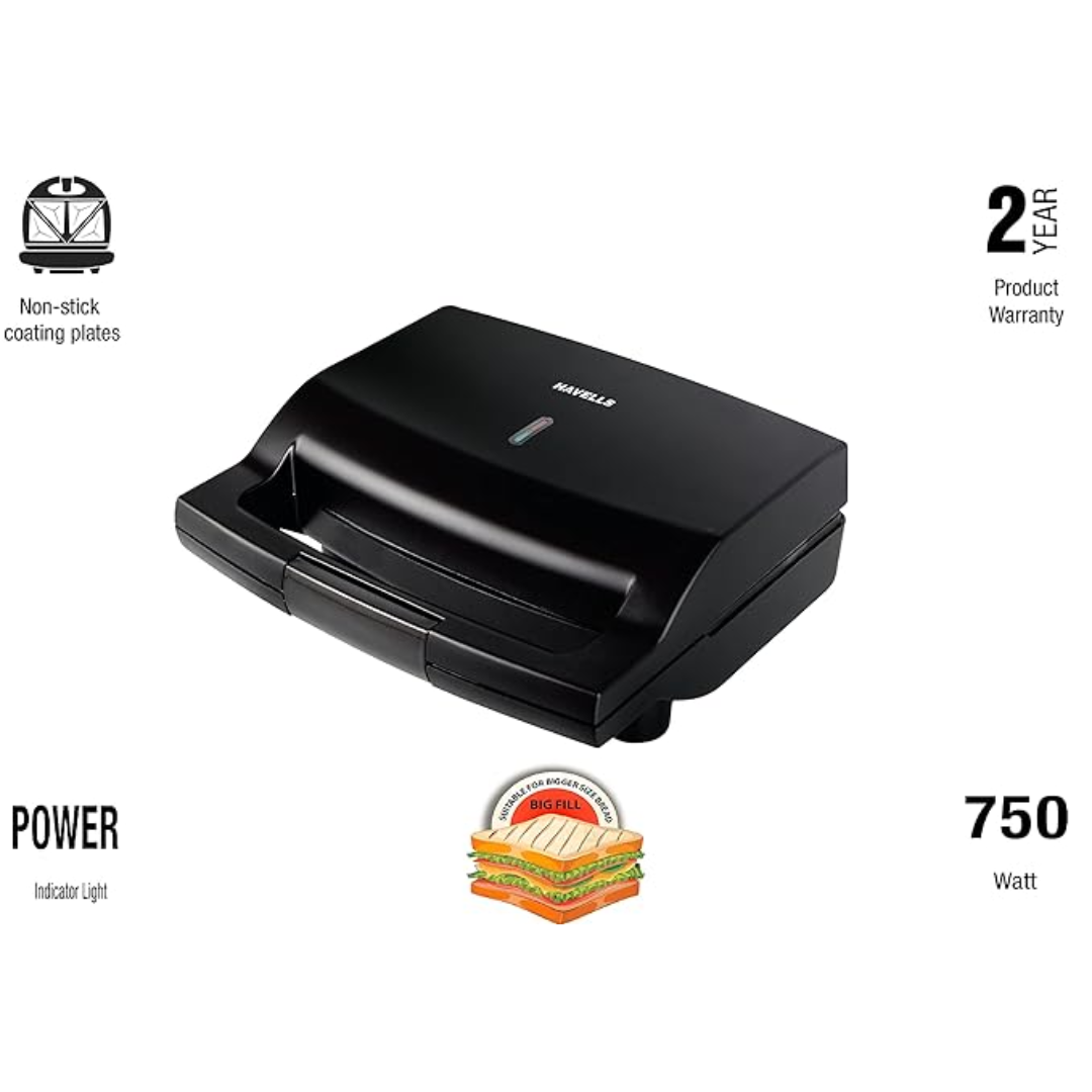 Havells Big Fill 2 Slice 750 watt Sandwich Maker with LED Indicator, Non Stick Coated Plate (Black), (Model: GHCSTCWK075)