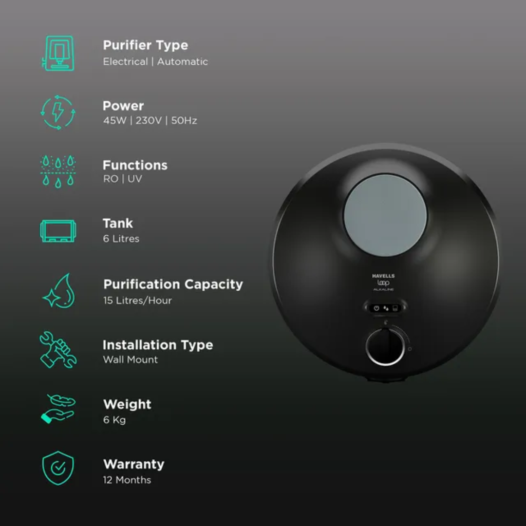 HAVELLS LOOP 6L RO + UV + Alkaline Water Purifier with Hygienic Flow Control (Silver Charged Membrane Technology, Black Color)
