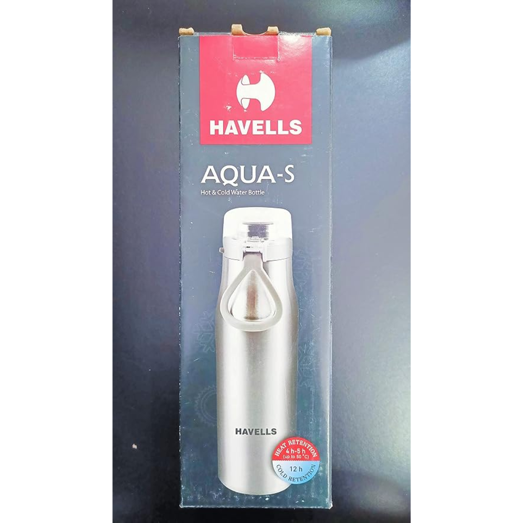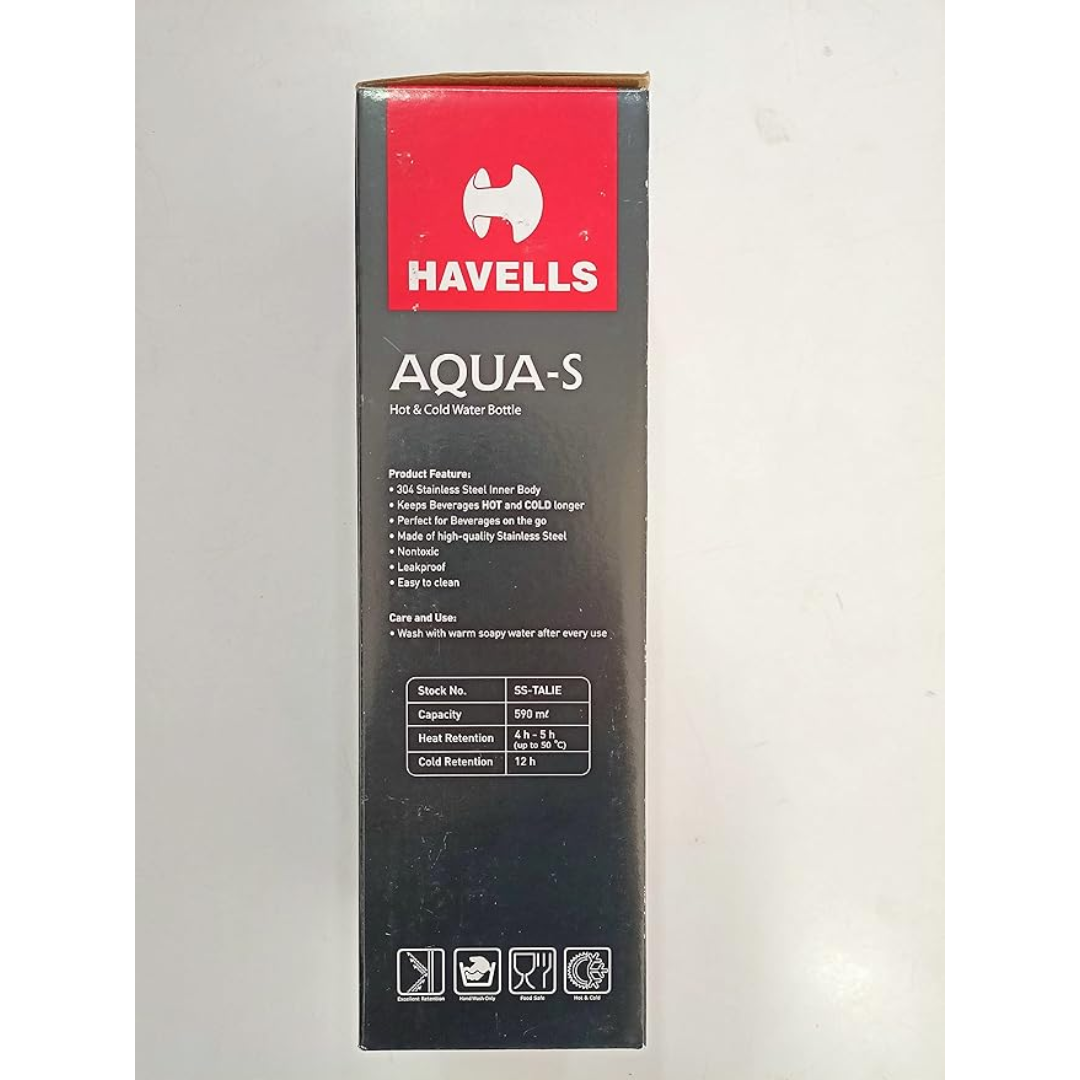 Havells Aqua-S Double Wall Hot/Cold Water Bottle, 304 Grade Stainless Steel Inner Body, Non Toxic, Leak Proof, Easy to Clean, 590 ml Silver